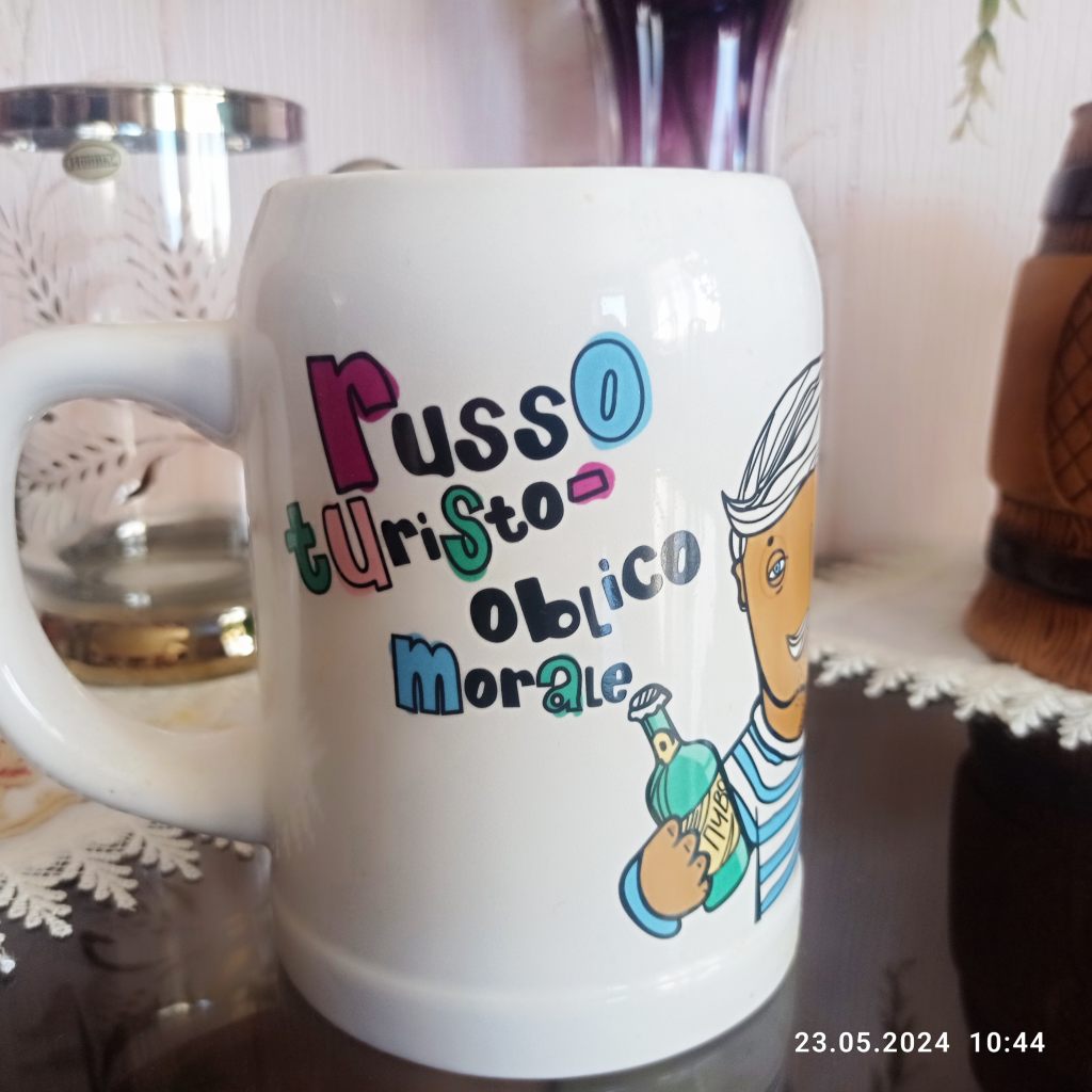 - кружка подарочная с надписью "RUSSO TURISTO OBLIKO MORALE", толстый глазурованный фаянс, объем 0,6л. , высота кружки 13 см. Привезена из Турции (400руб)