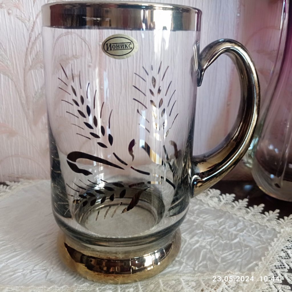 - кружка из прозрачного стекла с позолотой, Ионикс, объем 0.8л, высота 16см ( 400руб)