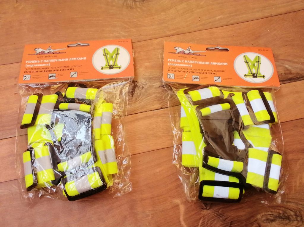 Ремень с диагональными наплечными лямками со световозращающим элементом в виде центральной полоски. Изготовлен из сшитых между собой широких резинок с регулируемыми пряжками-бегунками и застежкой фастексом. Крепиться на поясе и плечах человека для улучшения видимости на дальнем расстоянии в темное время суток.