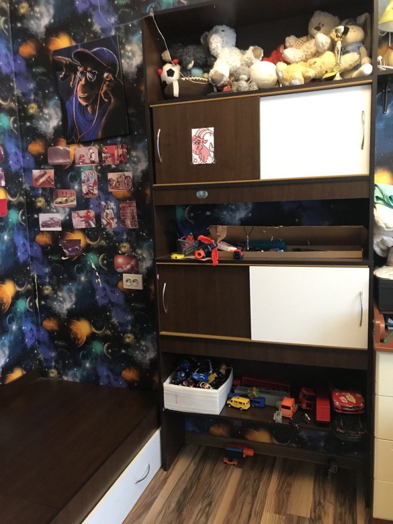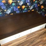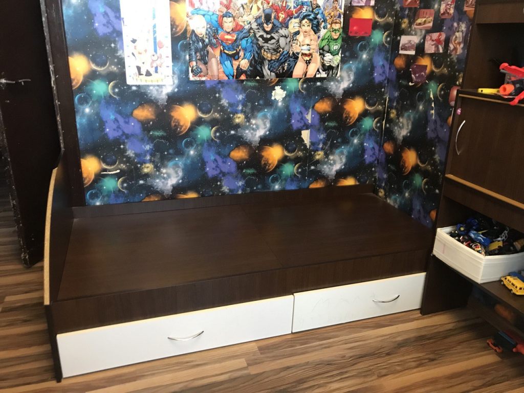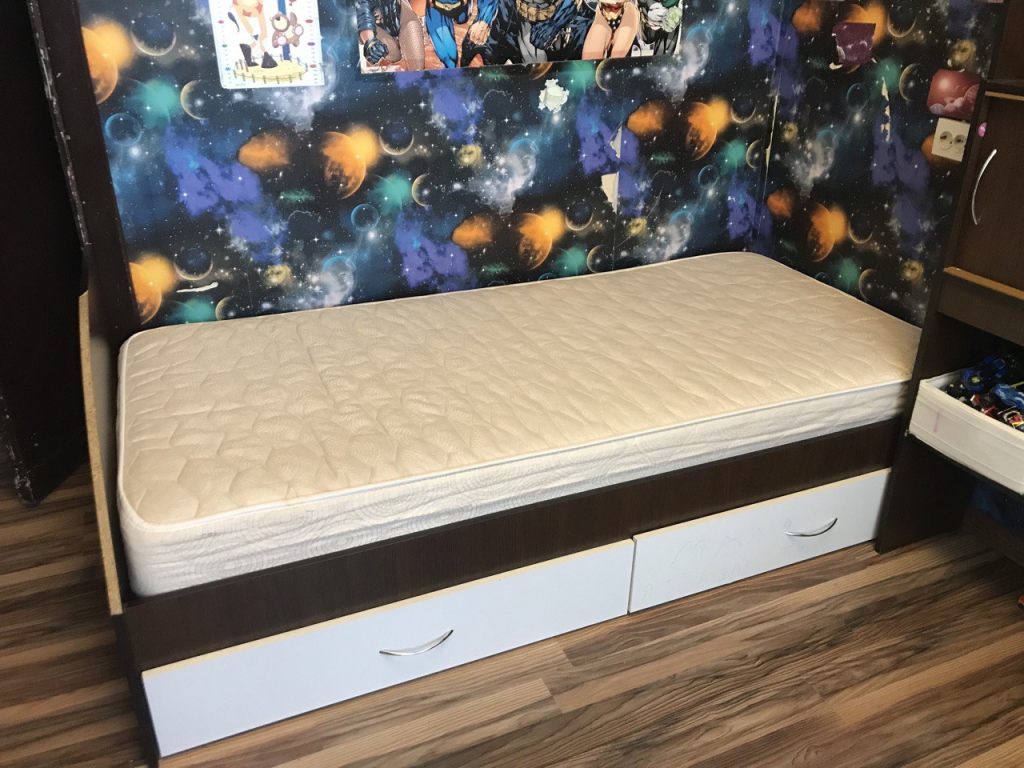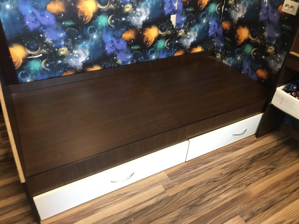 Продам односпальную кровать. В кровати вместительные выдвижные ящики, полки и ниши для хранения. Цвет белый+венге. Спальное место 90*190. Материал: ЛДСП. Размеры в сборе: д222*ш124*в108. Единственный минус: скругляли угол, чтобы ребенок не ударялся, и не наклеили кромку.