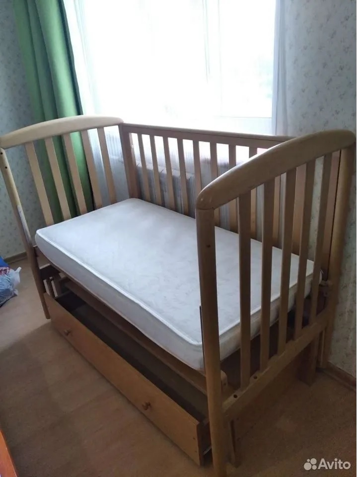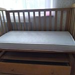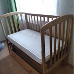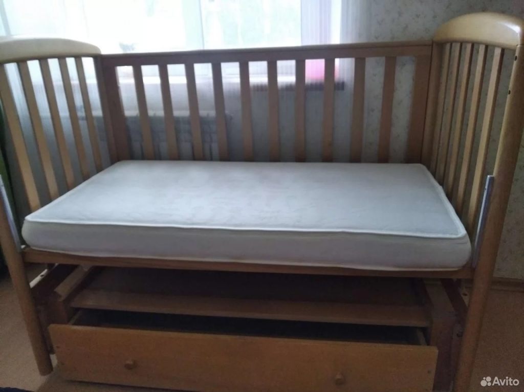 Детская кроватка из бука с маятником, ящиком для белья и матрасом. Все в хорошем состоянии. Одна стенка снимается, чтобы приставлять кроватку к родительской кровати. Самовывоз.