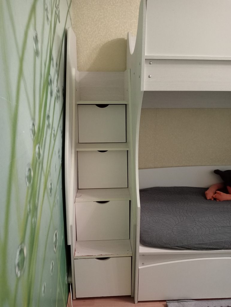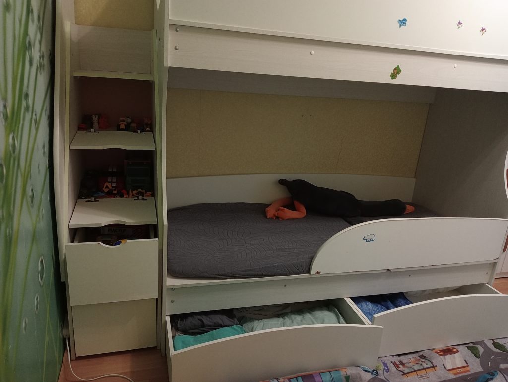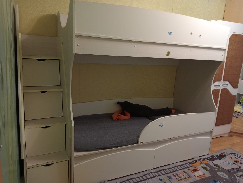 Продам двухъярусную кровать, со следами эксплуатации. Спальное место 80*200. В комплекте 2 вместительных ящика и 2 матраса. Лестница с ящиками. Все интересующие вопросы можете уточнить по телефону