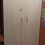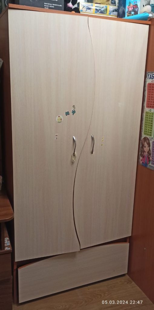 2. Шкаф из комплекта с кроватью (ШхГхВ) 85х42х177,5 левая часть полки, правая штанга. Внизу ящик выкатной на колесиках (сделан из бывшей верхней полки), глубина и ширина ящика по шкафу.