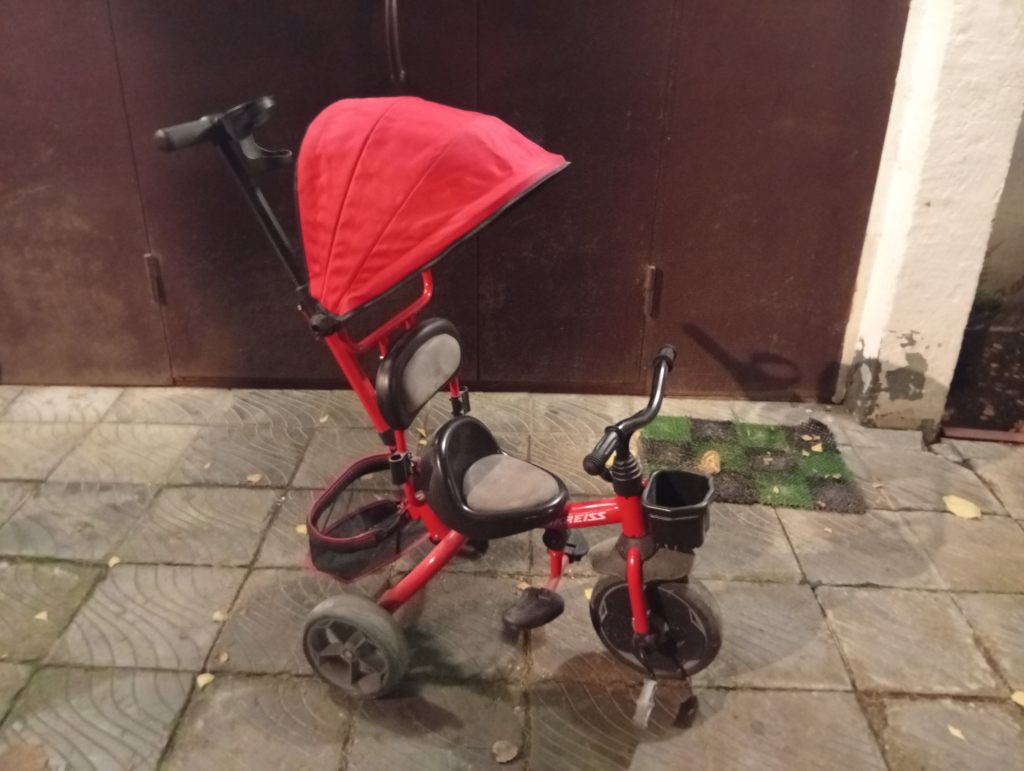 Трёхколёсный. Ручка управления с подстаканником, боковые поддержки в наличии, навес от дождя съёмный, два бардачка, подставки под ноги.