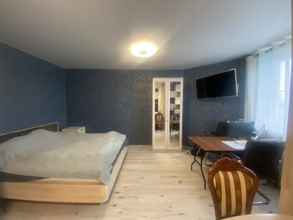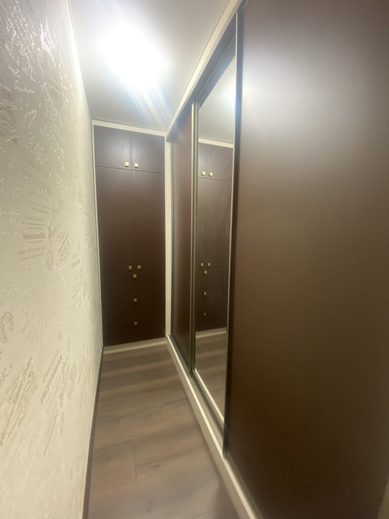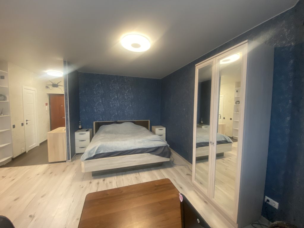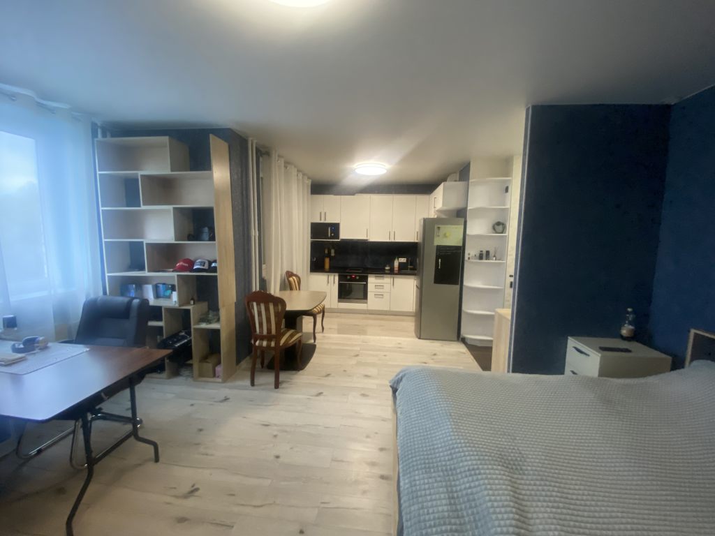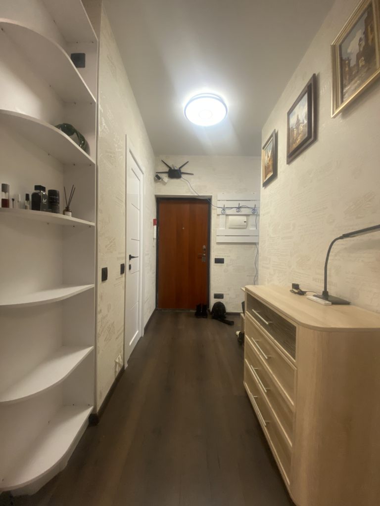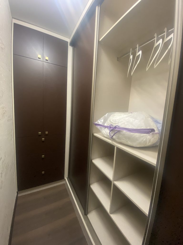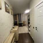 Вместительная качественная и дорогая гардеробная, прихожая, санузел совмещен, пространство комнаты поделено на рабочую зону и зону отдыха, кухня-столовая тоже в одном с ними пространстве, но выделены в отдельную зону. Устроено все очень комфортно.