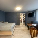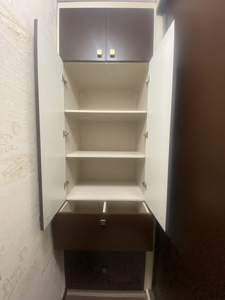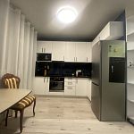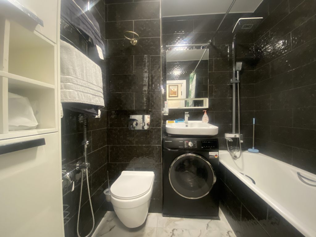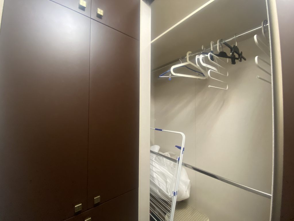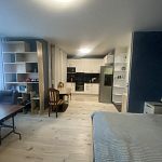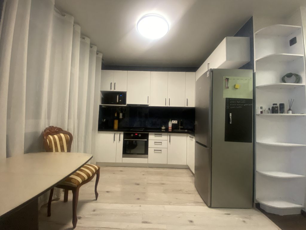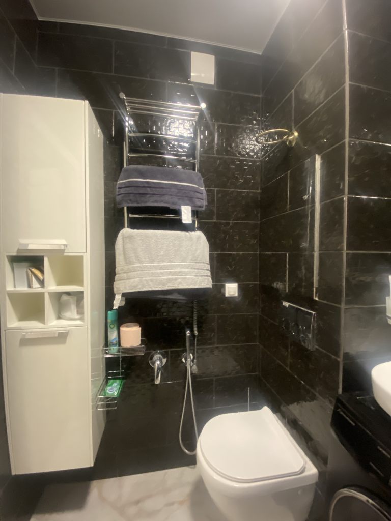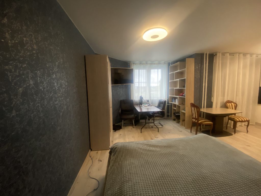 Вместительная качественная и дорогая гардеробная, прихожая, санузел совмещен, пространство комнаты поделено на рабочую зону и зону отдыха, кухня-столовая тоже в одном с ними пространстве, но выделены в отдельную зону. Устроено все очень комфортно.