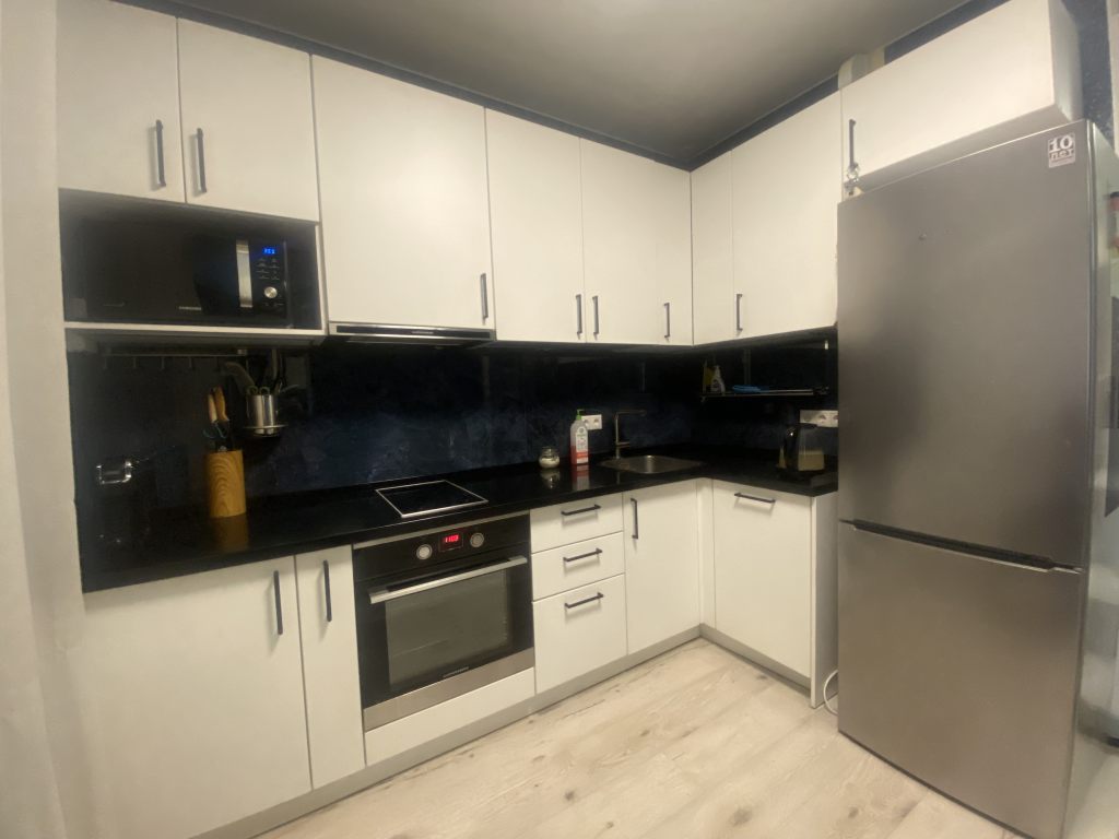 Ремонт выполнен из качественных, дорогостоящих материалов. Стены выровнены под покраску, потолки выровнены, пол плитка/паркетная доска, все стеклопакеты заменены и на всех окнах рулонные шторы блэкаут, балкон хорошо утеплен (зона релакса).
