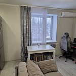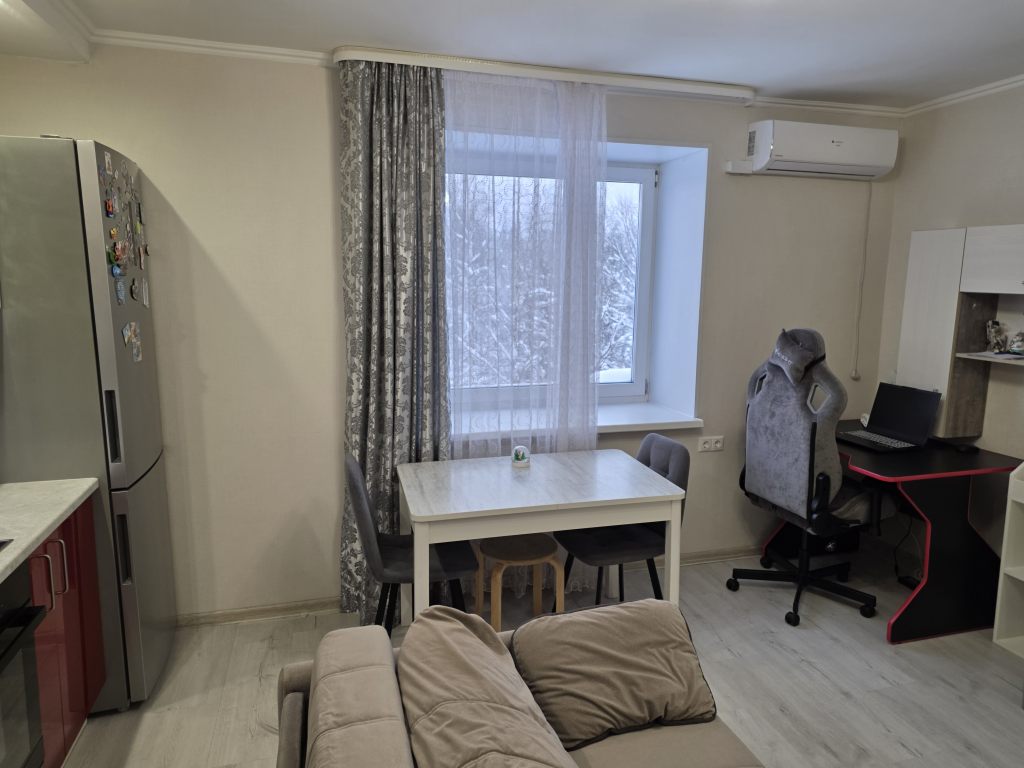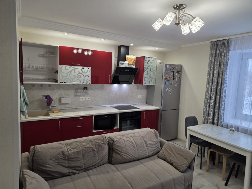 -кухня-гостиная 16,7 кв. м (кухонный гарнитур, холодильник, варочная панель, духовой шкаф встроенные, кондиционер, обеденный стол, стулья, диван, стенка)