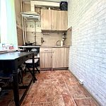 Кухня (5,3 кв.м), вмещает все необходимое: кухонный гарнитур, плита, холодильник, стол и стулья.