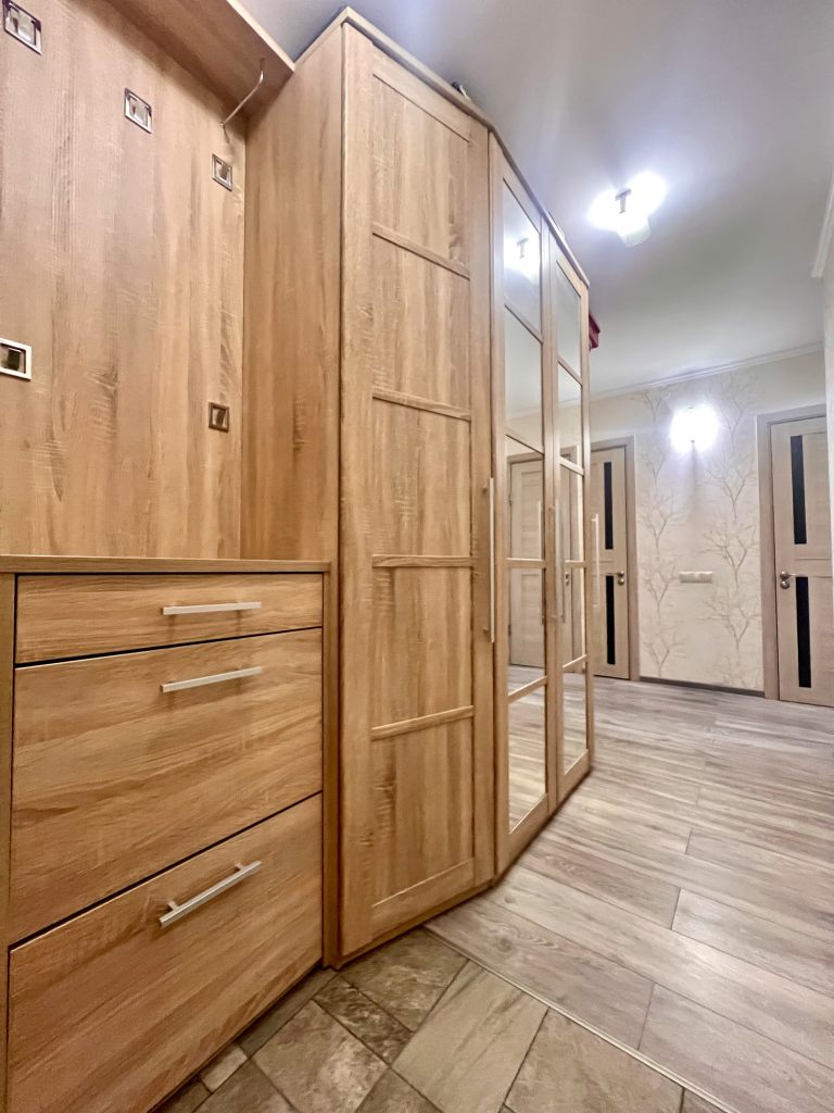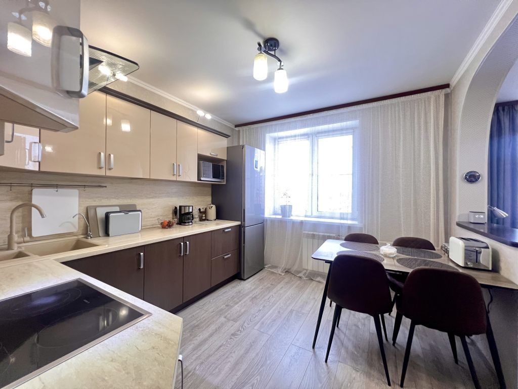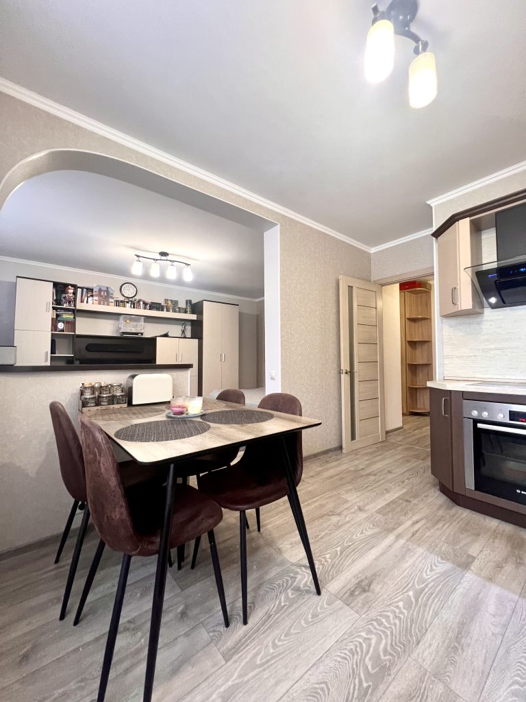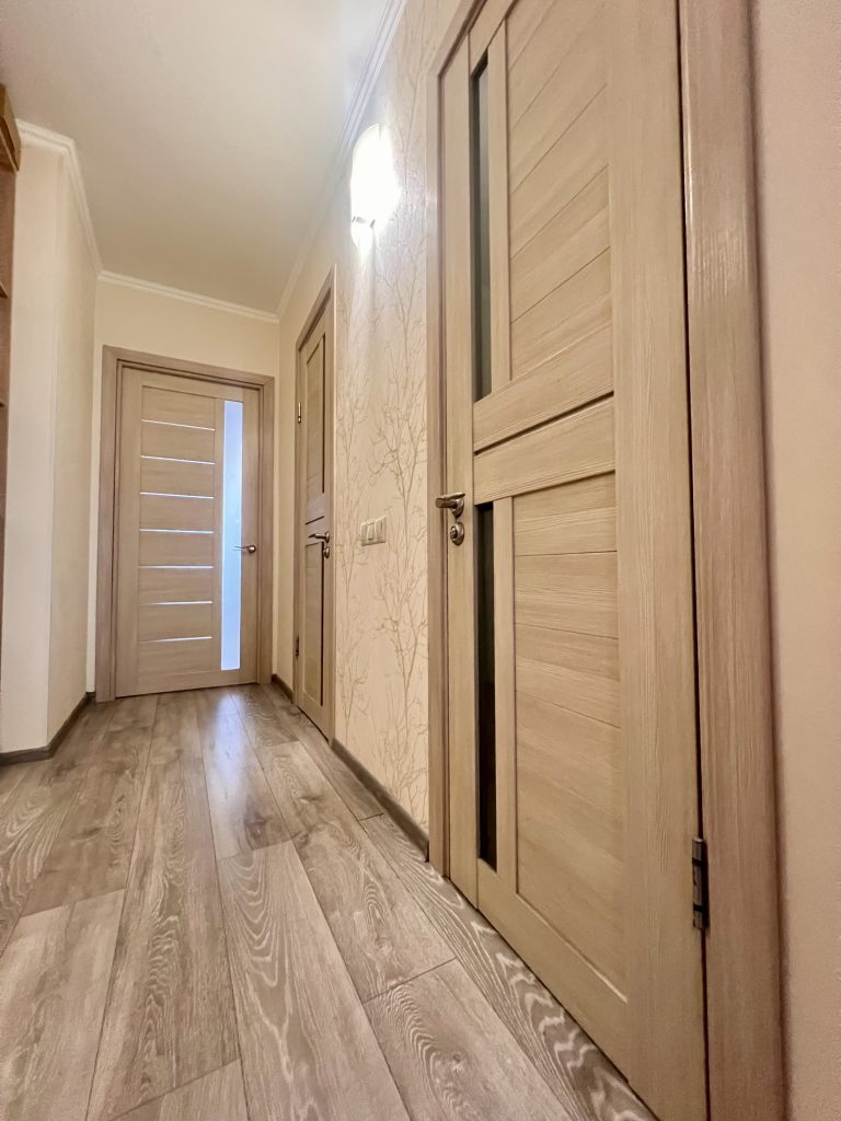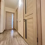 Качественная проводка, пол стяжка, выровнены стены, потолки, напольное покрытие - кухня, комнаты ламинат, санузел плитка. Установлены новые радиаторы. Межкомнатные двери в одном стиле.