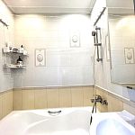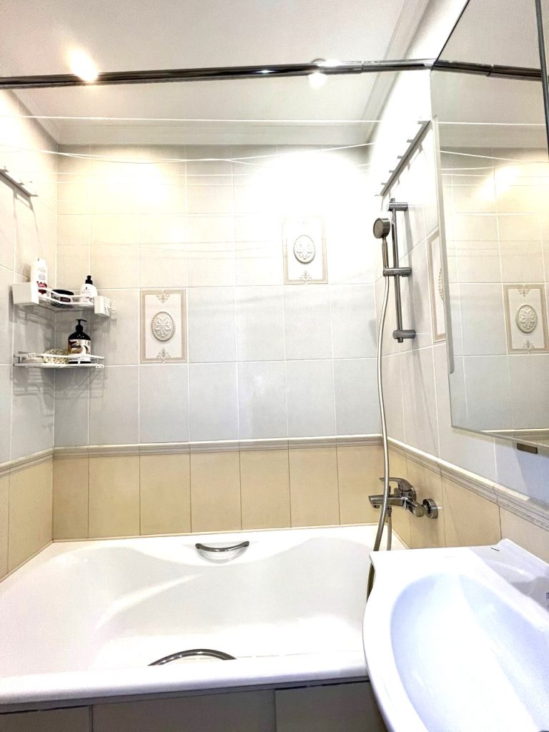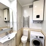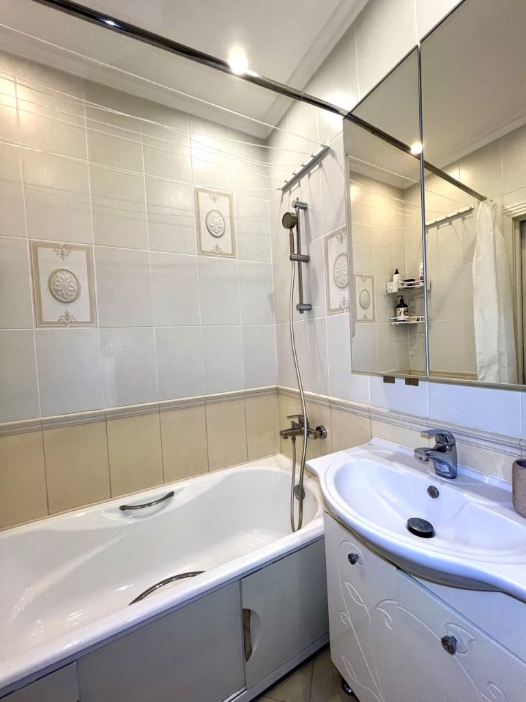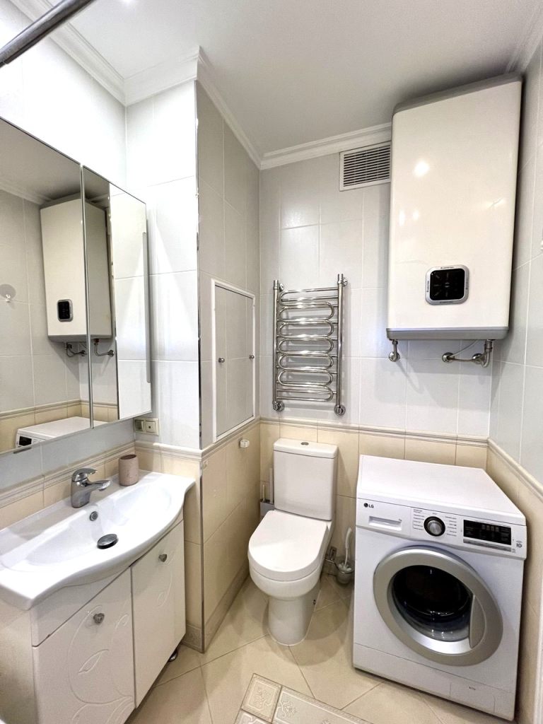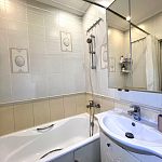Ванная комната совмещенная, но при этом очень просторная и эргономичная. Здесь с комфортом разместилось всё необходимое, включая стиральную машину, которая органично вписана в интерьер. Само помещение выдержано в нежной светло-бежевой гамме: керамическая плитка переливается в мягком свете, напоминая о песчаных пляжах Лазурного Берега. Это пространство дарит ощущение чистоты, релакса и утонченной простоты, где так приятно начинать и заканчивать день.