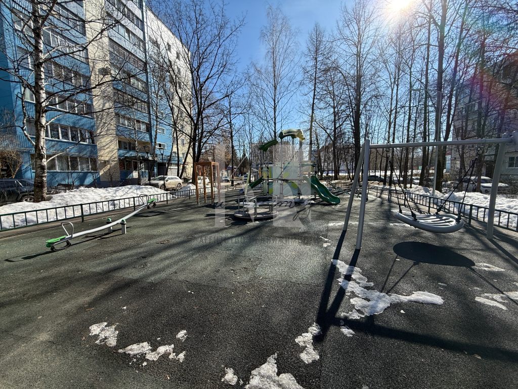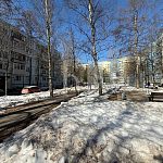 Тихий, благоустроенный двор с современной детской площадкой и спортивной коробкой.