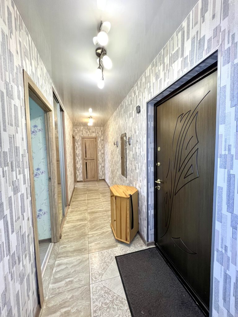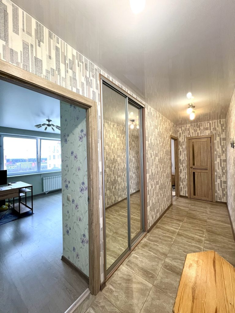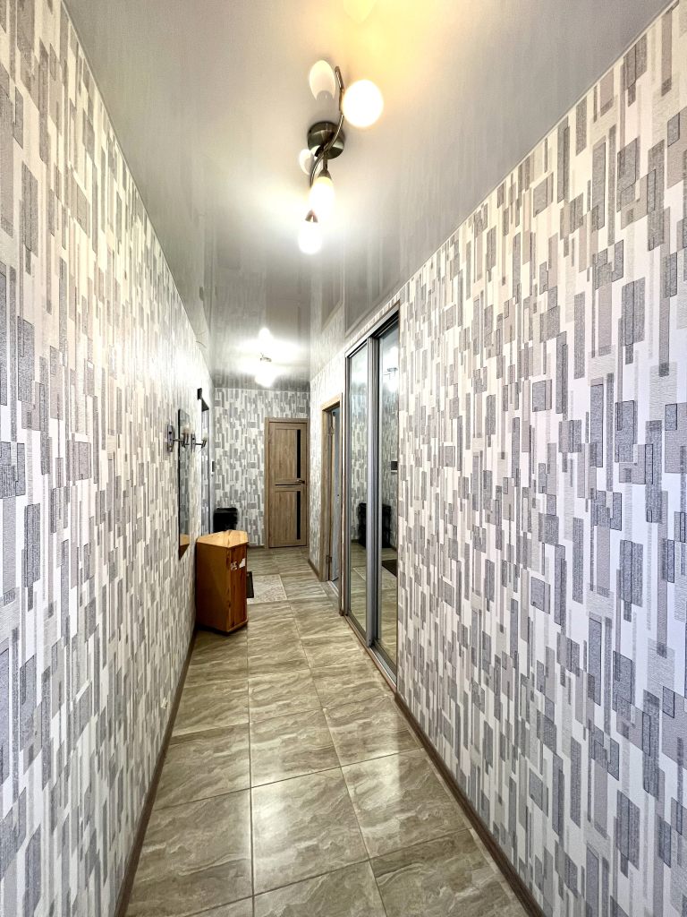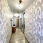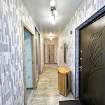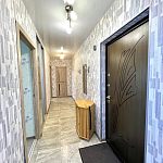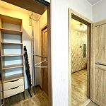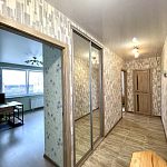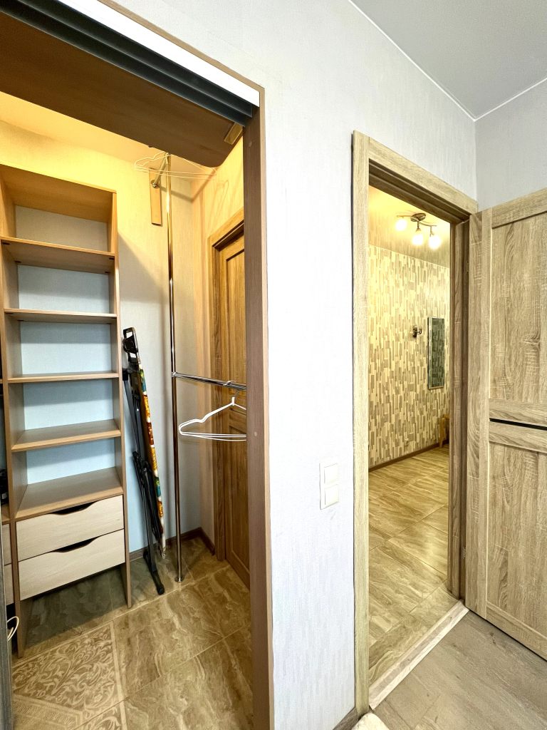 В квартире очень удобная прихожая — широкий коридор, где легко раздеться, есть куда повесить верхнюю одежду, ничто не мешает проходу. В коридоре и в большой комнате встроены шкафы-купе с огромными раздвижными зеркальными дверцами. Внутри продумана хорошая система хранения: всё разложено по полочкам, ничего не выпадает.