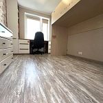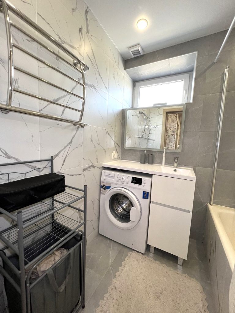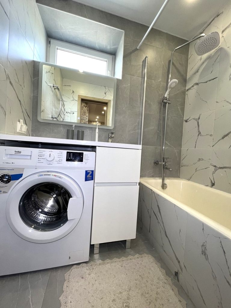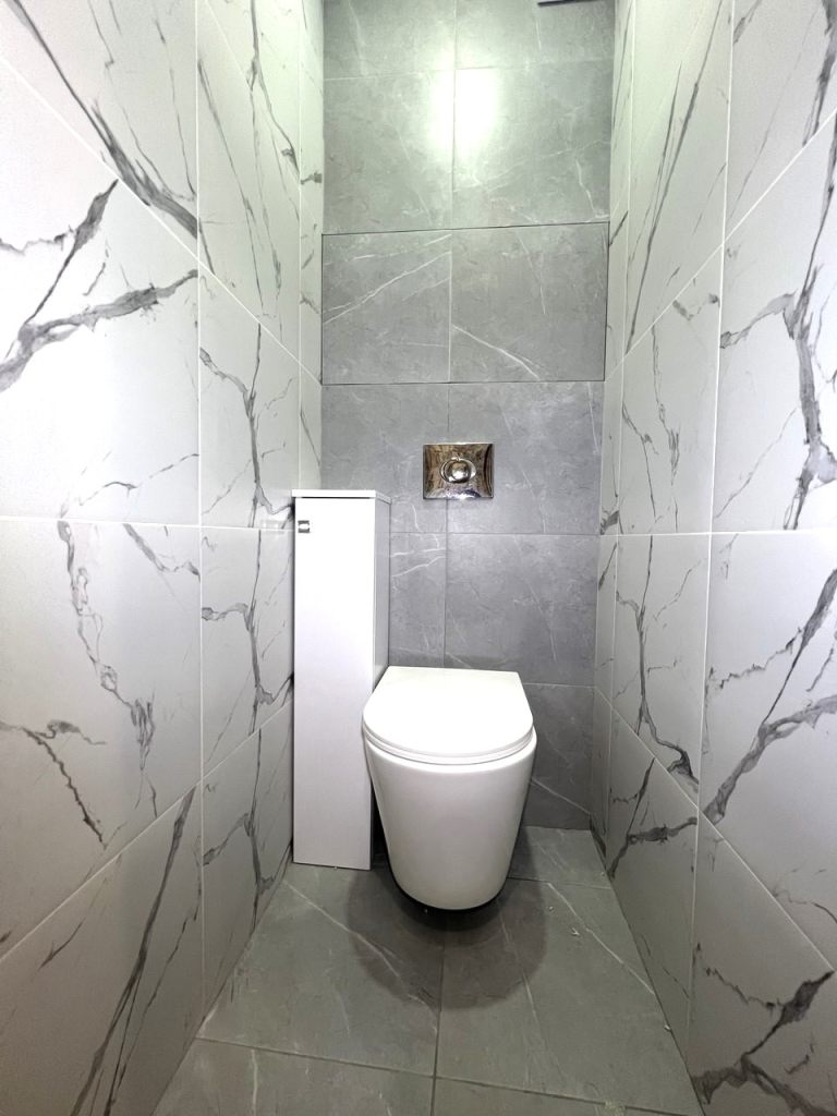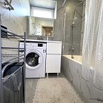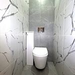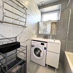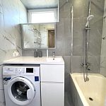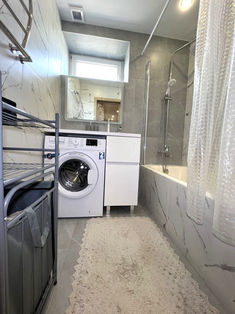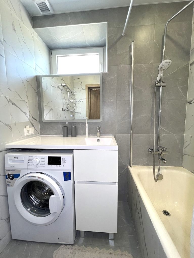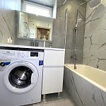 • Раздельный санузел: практичная и аккуратная отделка плиткой под мрамор. В просторной ванной комнате (3,1 м²) удобно разместилась стиральная машина, а также установлена классическая чугунная ванна и современный подвесной унитаз с инсталляцией.