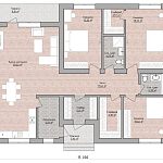 Планировка функциональная, продуманная: крыльцо под крышей 3,93 кв.м., тамбур с местами под встроенные зоны хранения 5,17 кв.м., гардеробная комната 6,38 кв.м., котельная 5,93 кв.м., 2 санузла (под ванную 4,38 кв.м. и душевую 4,59 кв.м.), 2 спальные комнаты с местами под зоны хранения 13,46/15,35 кв.м. (окна запад/восток) и еще одна спальная комната 18,32 кв.м. с гардеробной 3,57 кв.м. (окна запад), просторная гостиная-столовая совмещена с кухней, но разделена по зонам 39,23 кв.м. с выходом на террасу 8,10 кв.м. (юг и юго-запад).