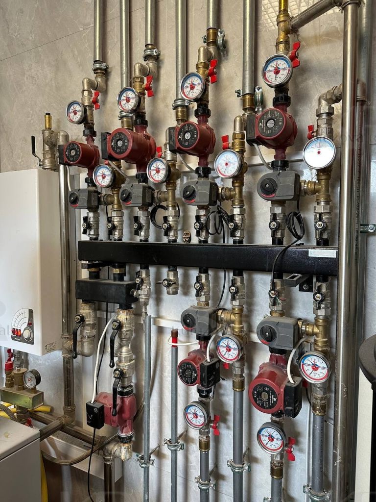Высота потолка -3.7 метров. К дому подведены все коммуникации: газ, электричество (60 кВт), канализация центральная. Тёплые полы на всех 3 этажах дома. В котельной установлен газовый котёл BAXI (+электрокотёл). Бойлер на 300 литров. Система очистки воды Сanature. Установлены 2 кондиционера.