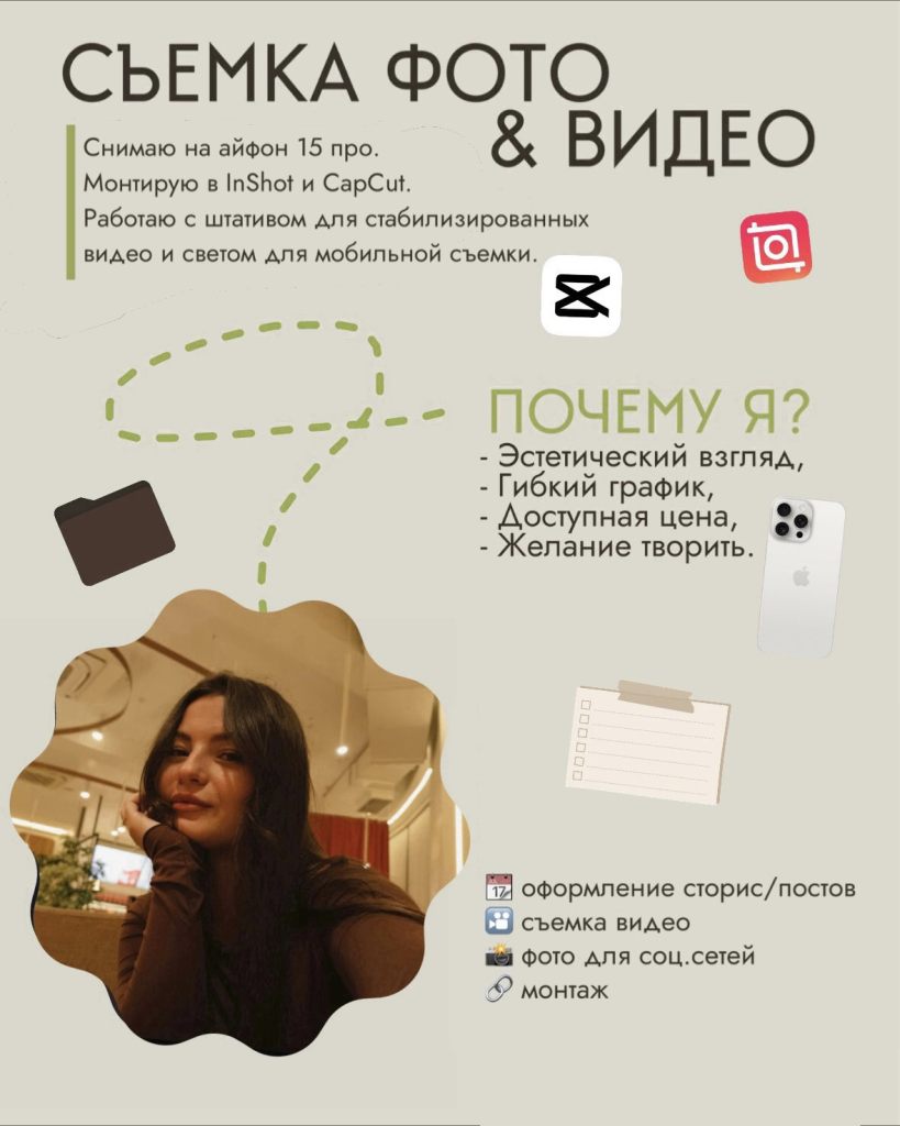 Привет! Я практикующий специалист по созданию мобильного видеоконтента и оформлению сторис для малого бизнеса. Умею снимать качественные фотографии и видео на телефон, эстетично оформлять сторис и монтировать интересные короткие ролики.