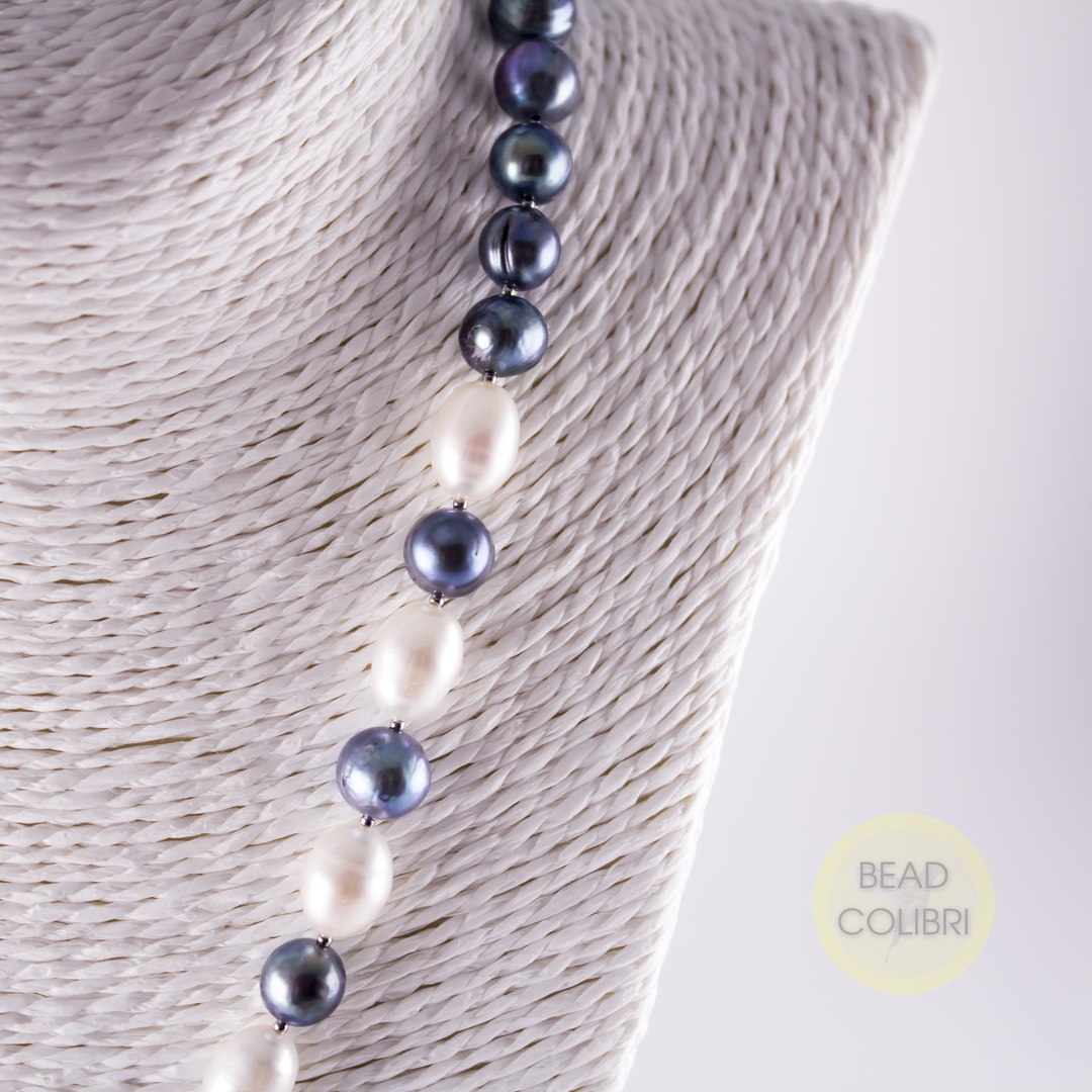 Стильный комплект из натурального жемчуга двух цветов, вставки бусинки серебра, ювелирный тросик. Застежки на серьгах серебро 925 пробы .