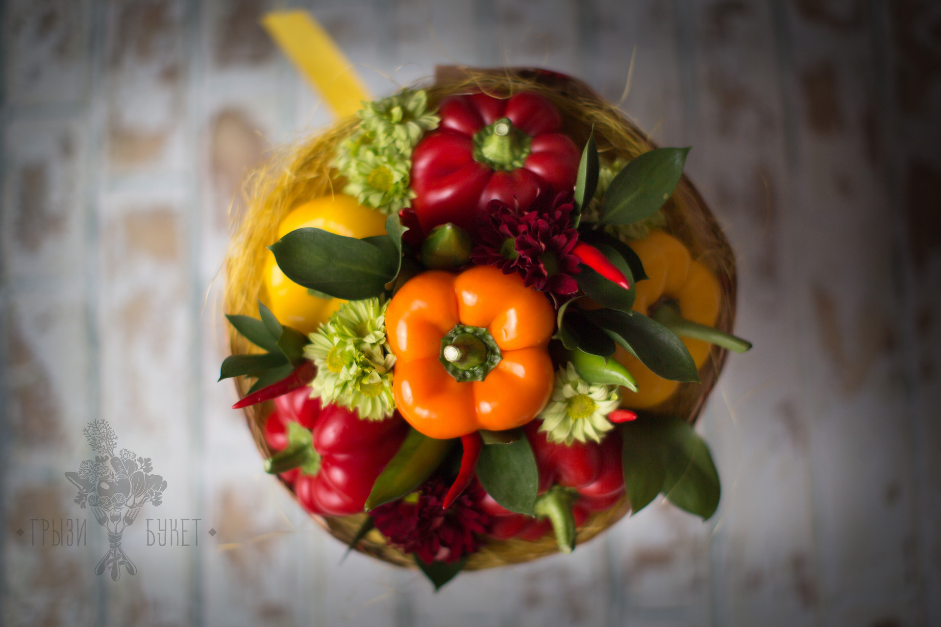 Яркий и сочный букет из ароматных и острых перчиков, украшенный хризантемой и рускусом на желтом сизалевом каркасе.