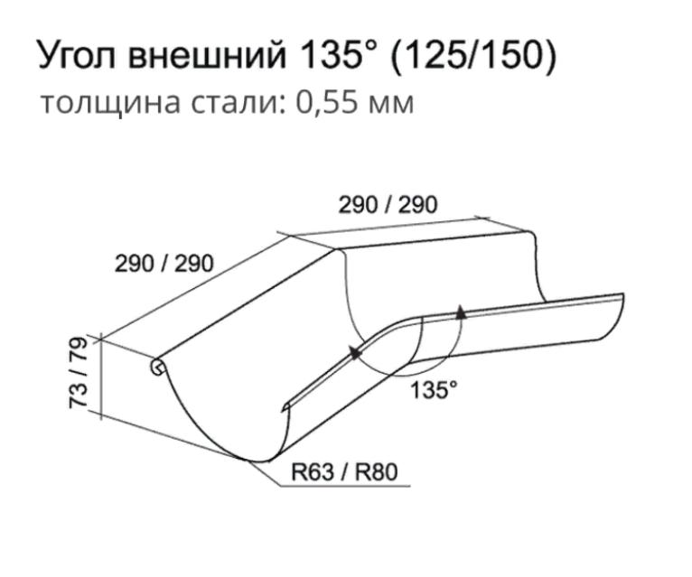 Угол желоба внешний 135 гр 125 мм (RAL 9005, RAL 9003, RAL 8017, RAL 8004, RAL 7024, RAL 6005, RAL 3011, RAL 3005, RR 29, RR 32, RR 11)
