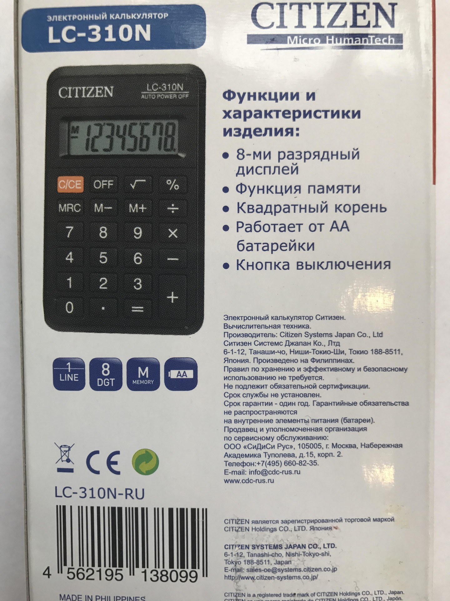 Главная / Магазины / Быстрое меню / КАНЦТОВАРЫ KUBIK RUBIK / Калькуляторы / Электронный калькулятор CITIZEN LC-310N