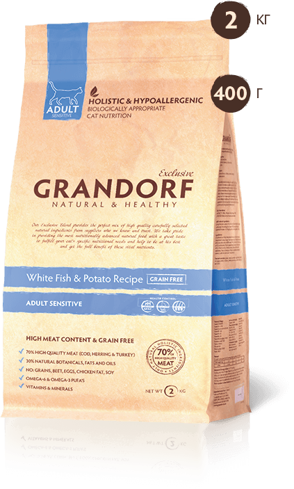 Главная / Магазины / Быстрое меню / Лапки-Царапки / GRANDORF / Кошки сухой рацион / БЕЛАЯ РЫБА С БАТАТОМ SENSITIVE 2кг