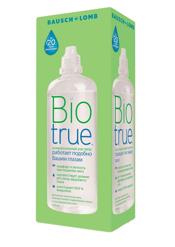 Раствор Biotrue — универсальный раствор для контактных линз, который имеет доказанную биосовместимость и обеспечивает 20 часов увлажнения линз за счет естественного полимера – гиалуронана.