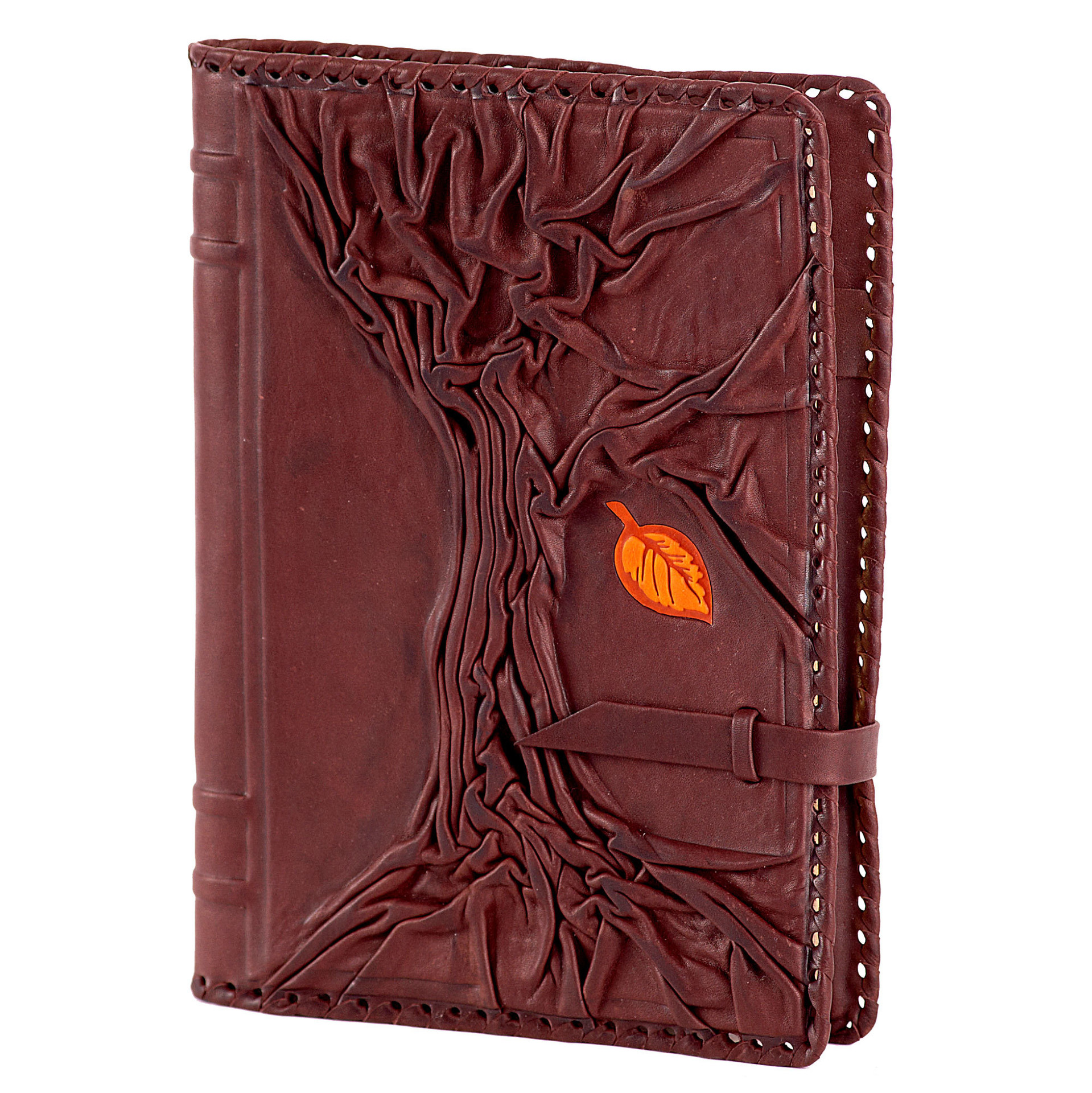 Оформление: кожаная оплетка по периметру изделия, удобная петелька для ручки, художественное тиснение, хлястик для фиксации