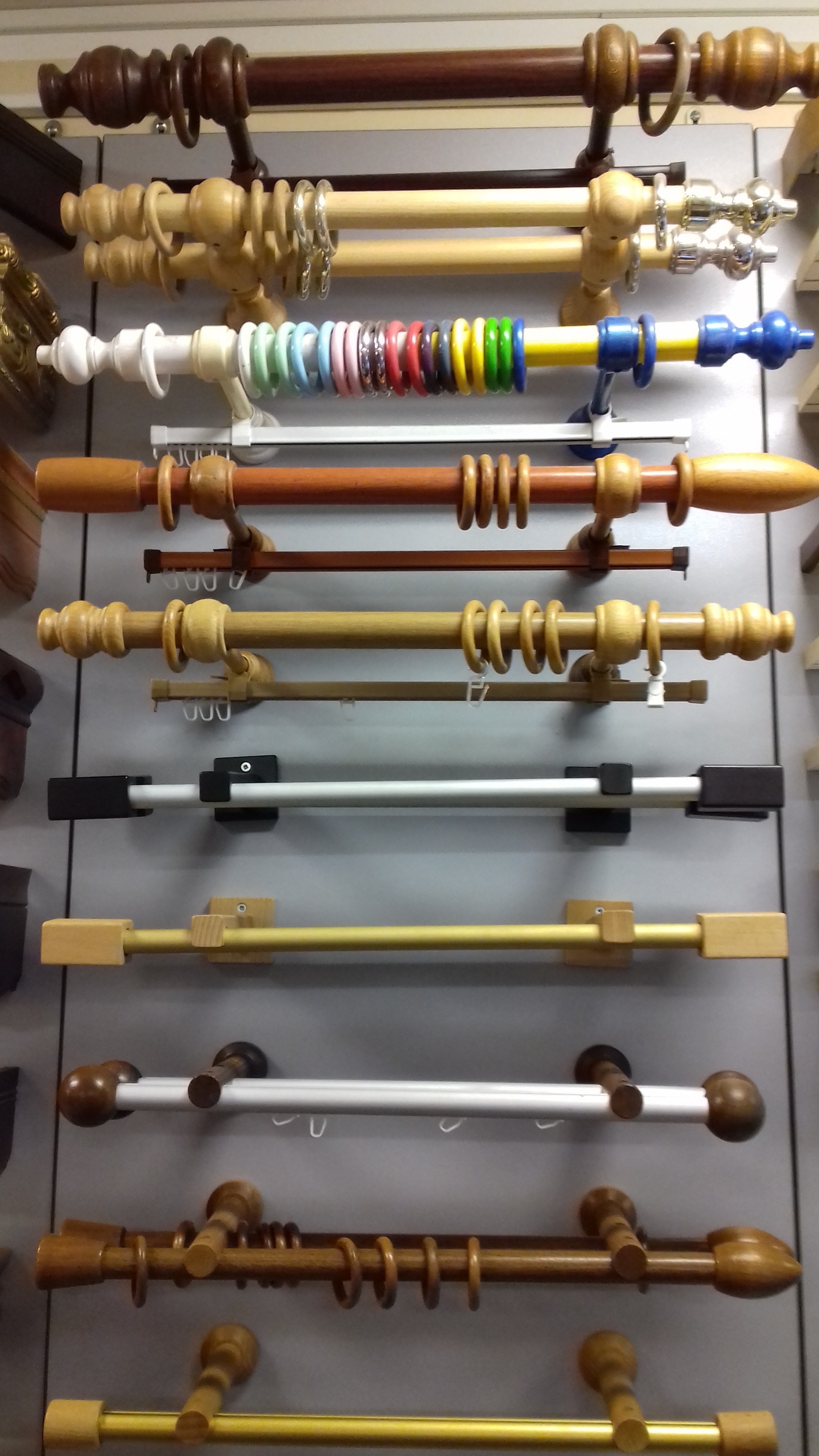 Круглые деревянные карнизы – большей частью относятся к карнизам эконом класса, поставляются полностью в собранном, уже готовым для монтажа, виде. Базовый диаметр составляет 28 мм. В комплект входит деревянная или металлопластиковая штанга, вторая направляющая (U-шина), кронштейны, наконечники и кольца. Есть модели с двумя штангами.