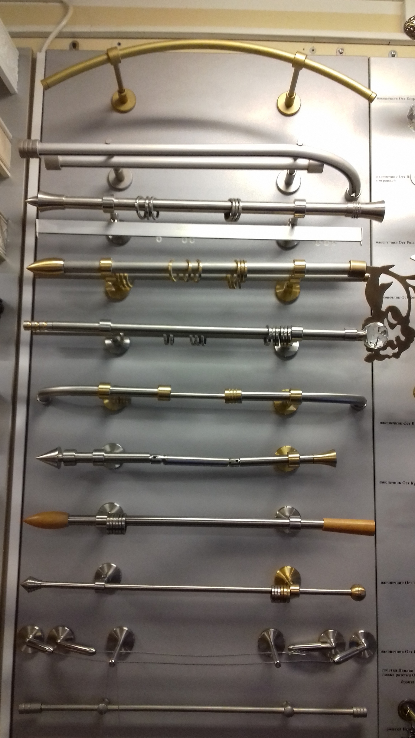 Металлические круглые карнизы бывают однорядными и двухрядными. Состоят из штанги (трубы), кронштейнов, наконечников и колец с зажимом или крючком. Основные диаметры штанг – 10, 16, 19, 25 мм. Штанги подразделяются на гладкие, рифленые, витые и фигурные. Кронштейны бывают нескольких видов, но в основном подразделяются на открытые и закрытые. Есть стеновые, потолочные и торцевые кронштейны. Кронштейны модели «Классика», «Техно», «Арт», «Деко», «Универсальный» и другие. Вариантов наконечников - также очень много. В качестве дополнительных опций предлагается стыковочный элемент, на тот случай, когда длина карниза более 3 метров, эркерный соединитель, с помощью которого получаются угловые карнизы для эркеров и полуэркеров.