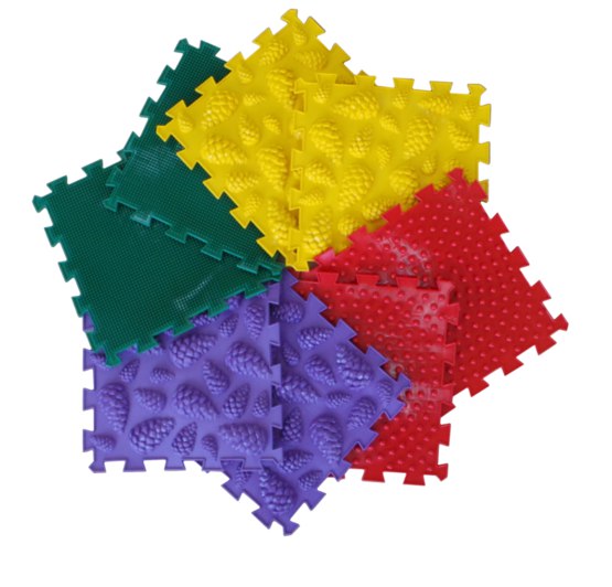 Специально разработанные рельефные поверхности позволяют с раннего возраста заниматься физическими упражнениями. Жесткая и мягкая поверхность ковриков позволяет чередовать степень воздействия на подошвенную поверхность.